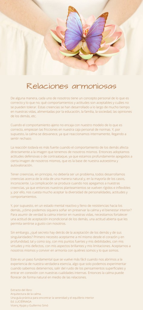 This is a fundamental step that becomes easier when we open ourselves to the experience of our true essence, something that we can only experience when we know how to stop, get out of the noise of superficial thoughts and connect with our inner qualities. Then calm can flourish naturally in the midst of relationships.