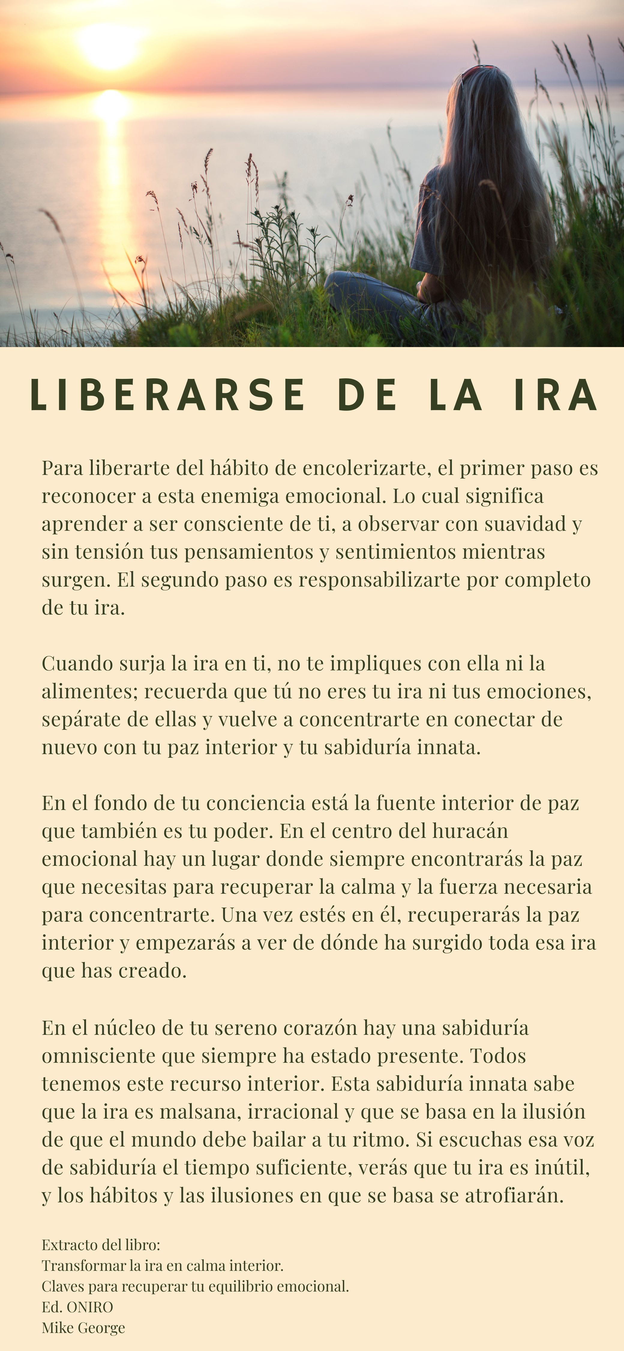Quan sorgeixi la ira en tu, no t’hi impliquis ni l’alimentis; recorda que tu no ets la teva ira ni les teves emocions, separa’t d’elles i torna a concentrar-te a connectar de nou amb la teva pau interior i la teva saviesa innata.