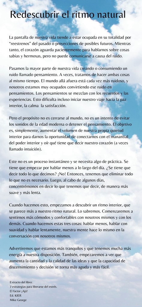 Cuando hacemos esto, empezamos a descubrir un ritmo interior, que se parece más a nuestro ritmo natural. Lo sabremos. Comenzaremos a sentirnos más cómodos y confortables con nosotros mismos y con los demás. Cuando hacemos estas tres cosas: -hablar menos, hablar con suavidad y hablar lentamente-, nuestra mente hace lo mismo en la conversación con nosotros mismos.