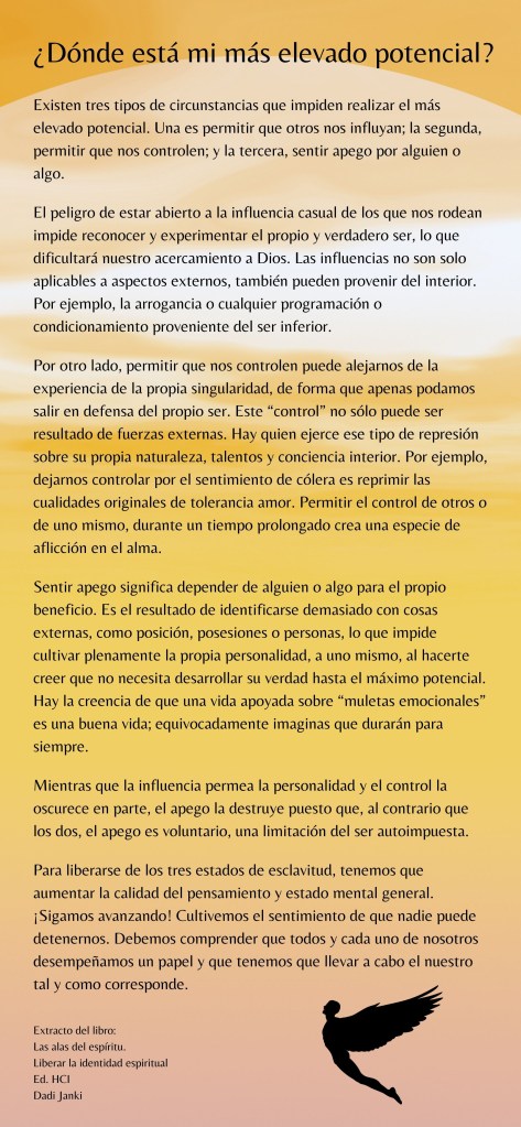 Hi ha tres tipus de circumstàncies que impedeixen realitzar el potencial més elevat. Una és permetre que altres ens influeixin; la segona, permetre que ens controlin; i la tercera, sentir aferrament per algú o per alguna cosa.
