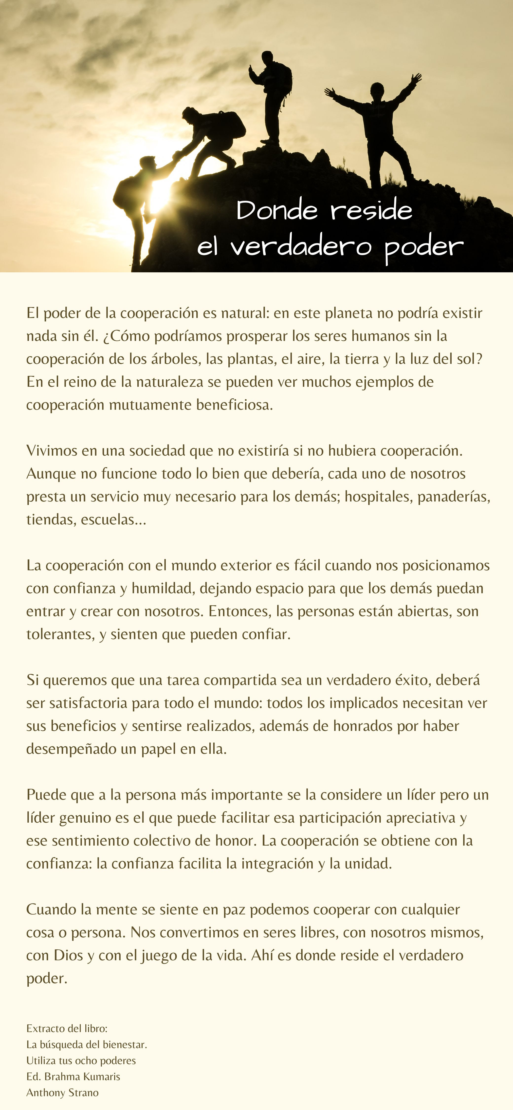 El poder de la cooperació és natural: en aquest planeta no hi podria haver res sense això. Com podríem prosperar els éssers humans sense la cooperació dels arbres, les plantes, l’aire, la terra i la llum del sol? en el regne de la natura es poden veure molts exemples de cooperació mútuament beneficiosa.
