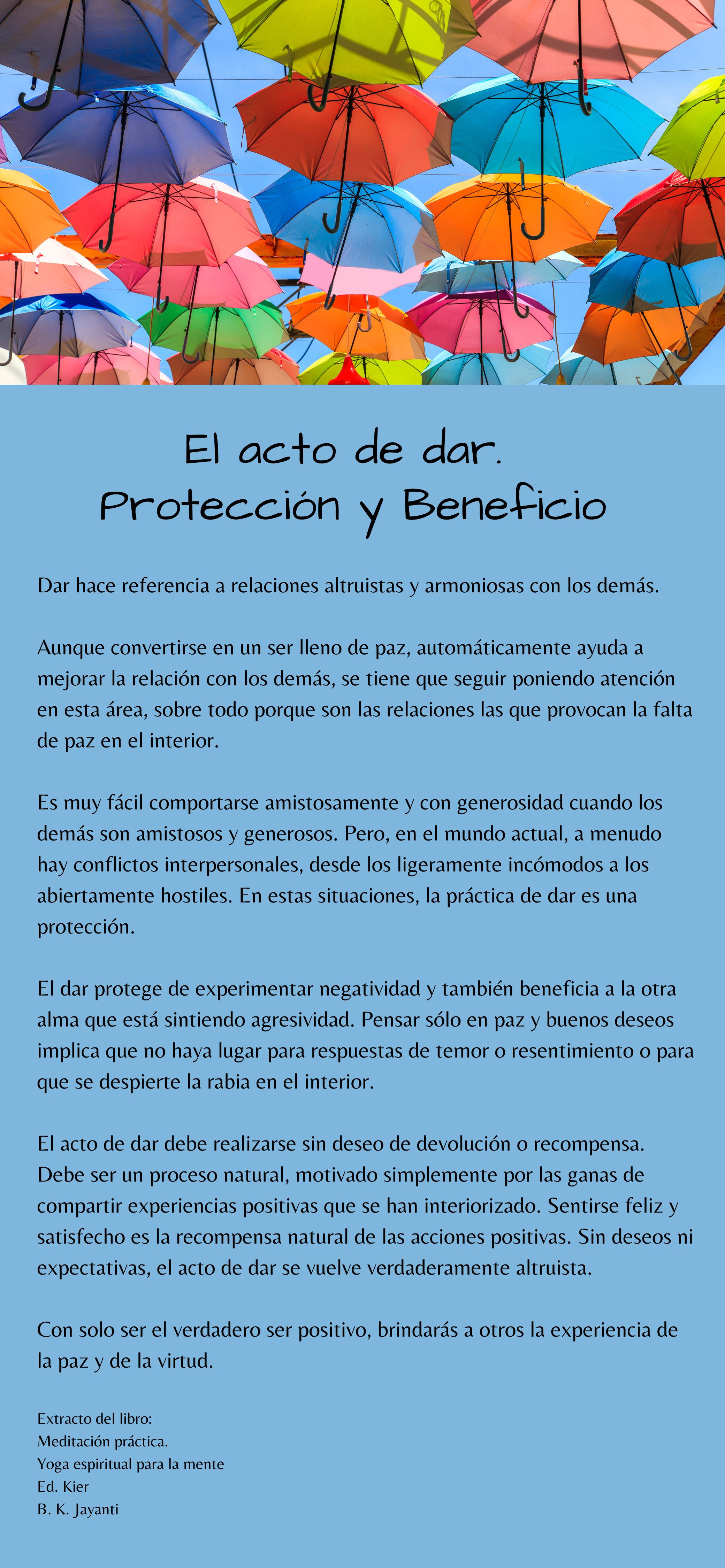 El dar protege de experimentar negatividad y también beneficia a la otra alma que está sintiendo agresividad. Pensar sólo en paz y buenos deseos implica que no haya lugar para respuestas de temor o resentimiento o para que se despierte la rabia en el interior.