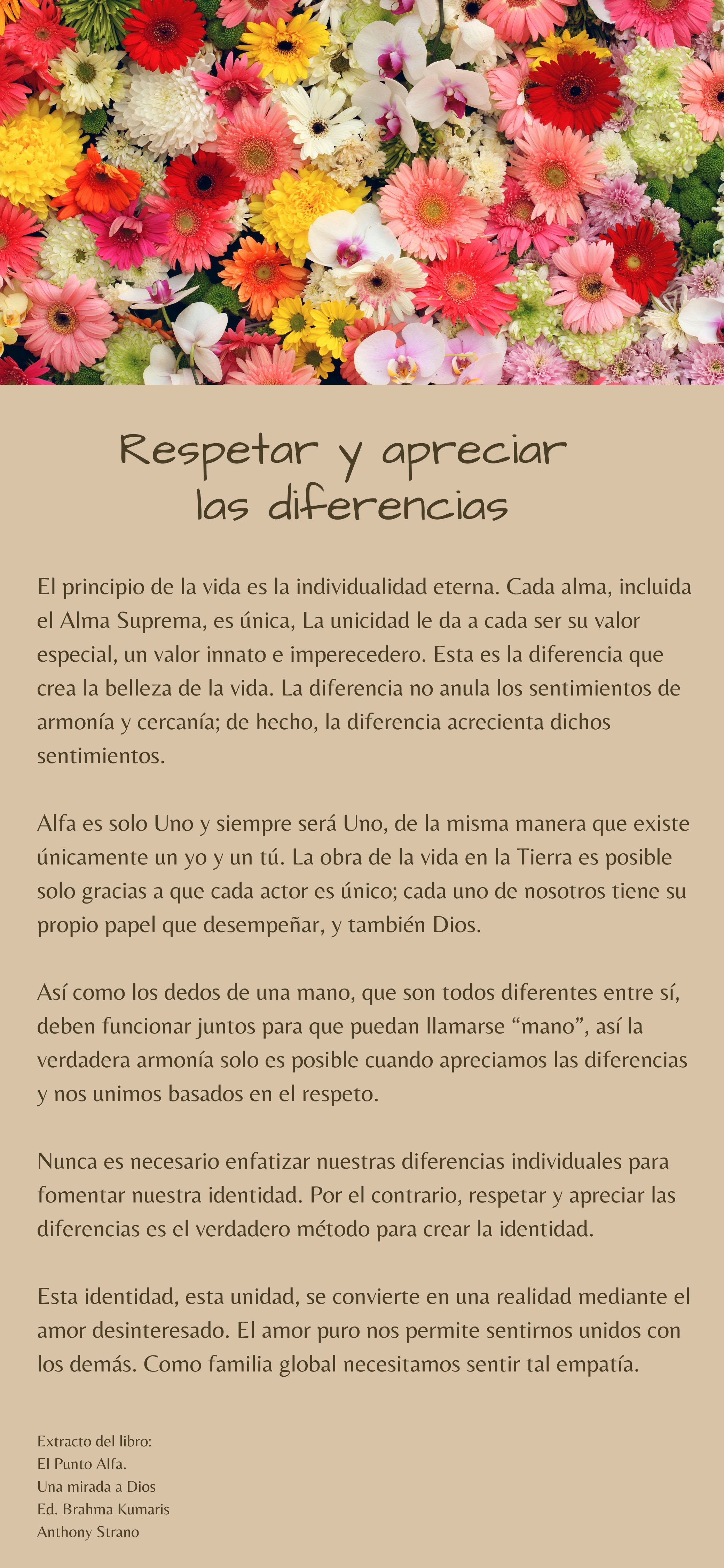 El principi de la vida es la individualidad eterna. Cada alma, incluida el Alma Suprema, es única. La unicidad le da a cada ser su valor especial, un valor innato e imperecedero. Esta es la diferencia que crea la belleza de la vida. La diferencia no anula los sentimientos de armonía y cercanía; de hecho, la diferencia acrecienta dichos sentimientos.