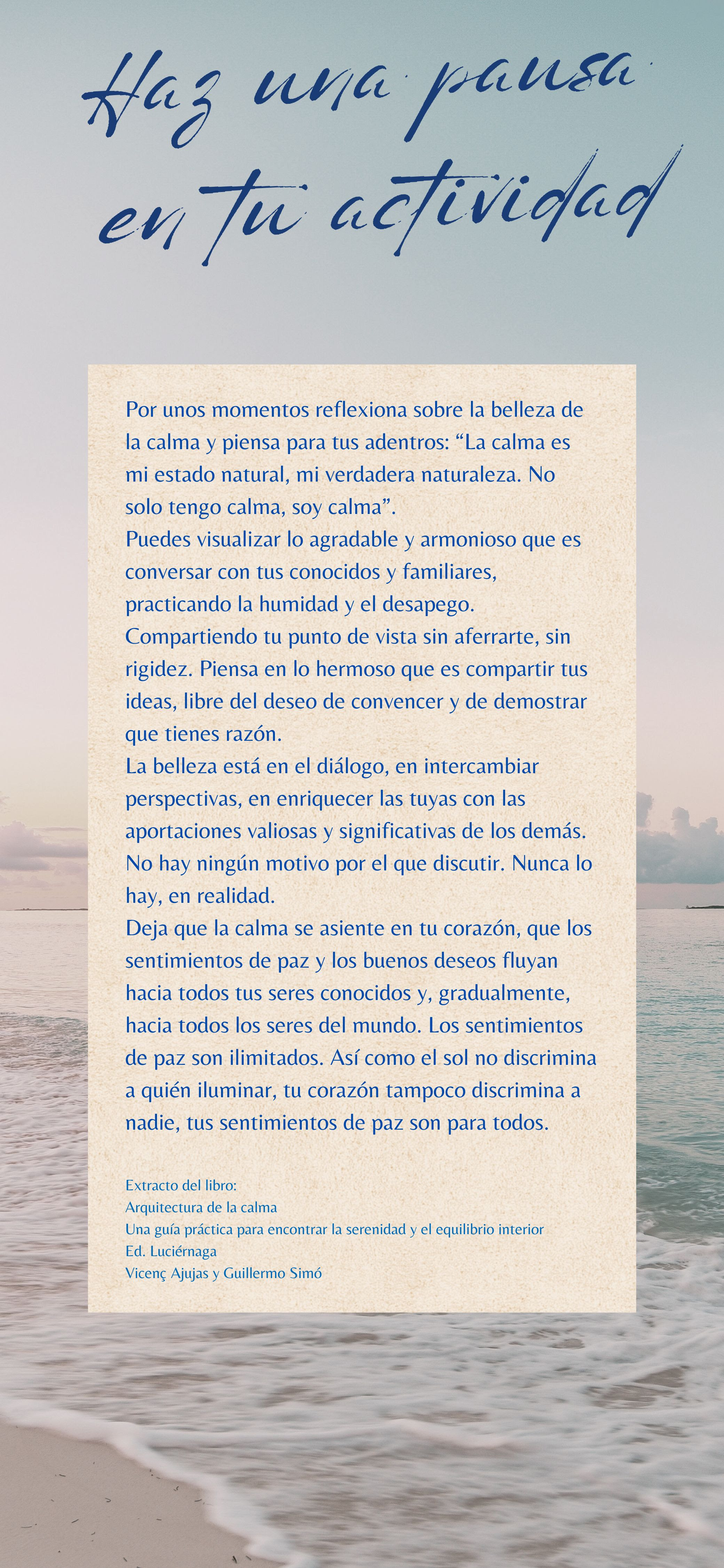 Por unos momentos reflexiona sobre la belleza de la calma y piensa para tus adentros: “La calma es mi estado natural, mi verdadera naturaleza. No solo tengo calma, soy calma”.