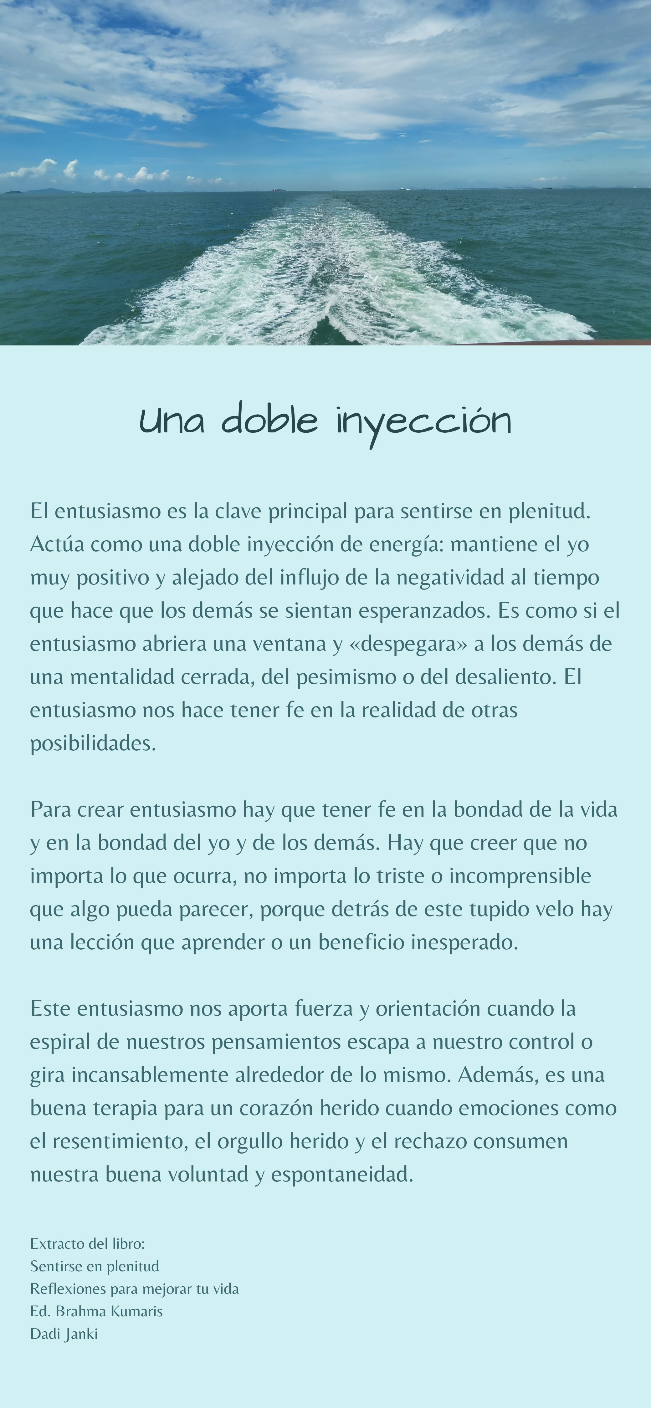 Actua com una doble injecció d’energia: manté el jo molt positiu i allunyat de l’influx de la negativitat alhora que fa que els altres se sentin esperançats. És com si l’entusiasme obrís una finestra i “desenganxés” els altres d’una mentalitat tancada, del pessimisme o del desànim. L’entusiasme ens fa tenir fe en la realitat d’altres possibilitats.