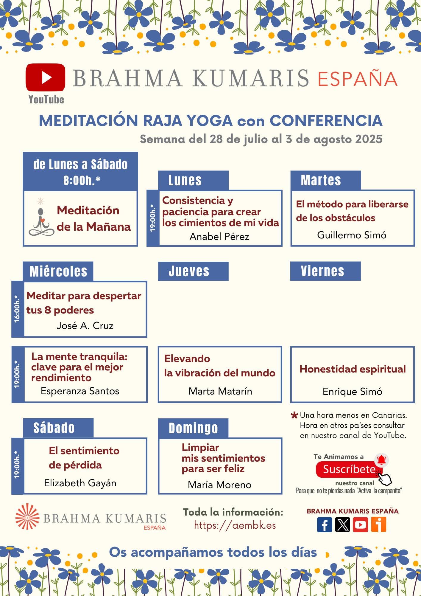 Del 28 de julio al 3 de agosto del 2025, te invitamos a participar en nuestras “Meditaciones Raja Yoga con conferencia” desde el Canal de YouTube Brahma Kumaris España. ✅Suscríbete y 🔔 Activa la Campanita para que no te pierdas nada https://www.youtube.com/BrahmaKumarisEspaña Os acompañamos todos los días.