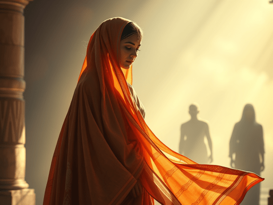 1En una pintura antigua, se representa una corte llena de hombres lujuriosos con deseos de vicio, con Draupadi en medio y tirando de su sari para desnudarla delante de todos; un sari que nunca se terminaba porque “Dios” le enviaba infinitas telas que la envolvían.