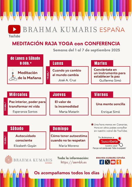 Del 1 al 7 de septiembre del 2025, te invitamos a participar en nuestras “Meditaciones Raja Yoga con conferencia” desde el Canal de YouTube Brahma Kumaris España.