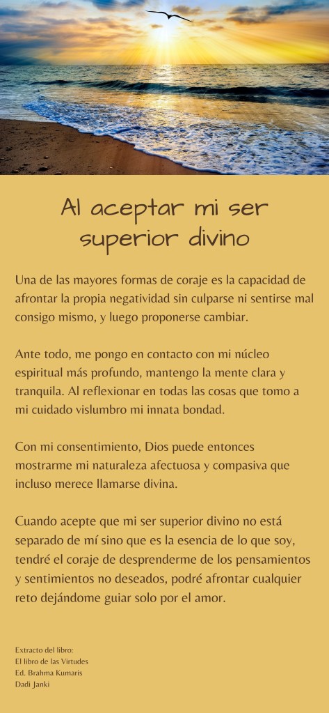 Cuando acepte que mi ser superior divino no está separado de mí sino que es la esencia de lo que soy, tendré el coraje de desprenderme de los pensamientos y sentimientos no deseados, podré afrontar cualquier reto dejándome guiar solo por el amor.