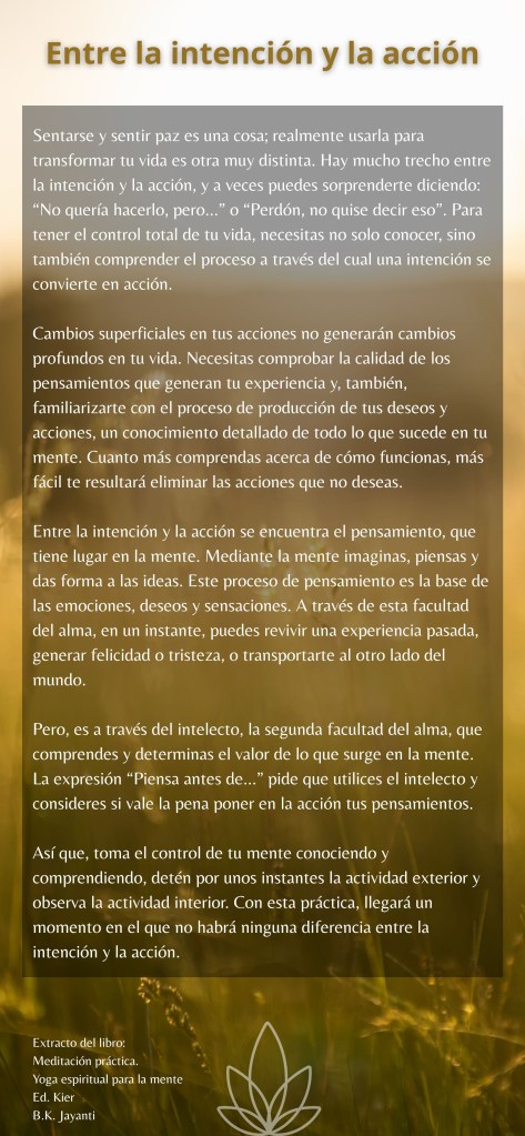 Así que, toma el control de tu mente conociendo y comprendiendo, detén por unos instantes la actividad exterior y observa la actividad interior. Con esta práctica, llegará un momento en el que no habrá ninguna diferencia entre la intención y la acción.