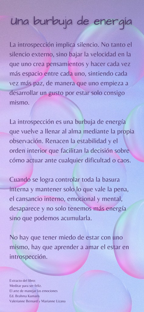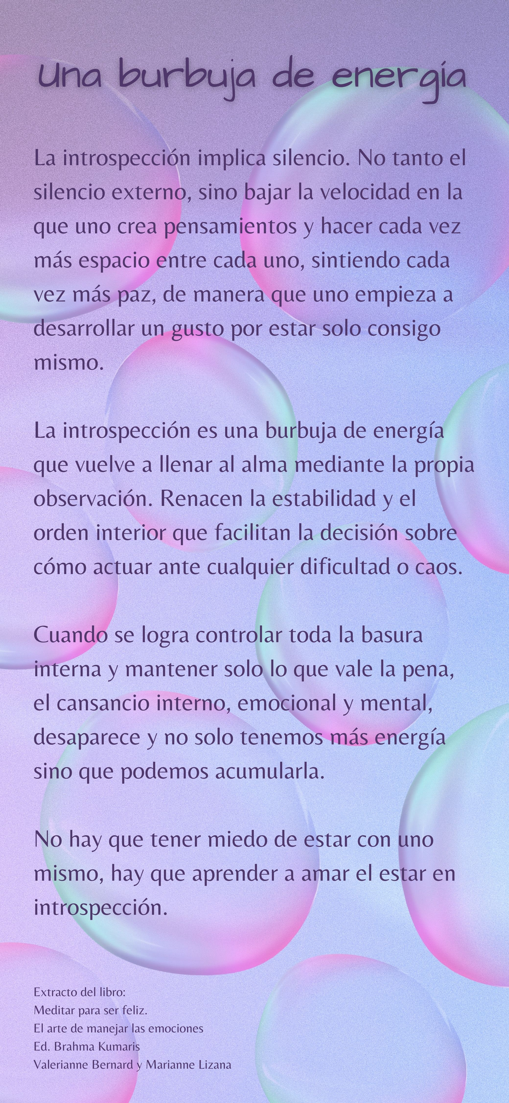 La introspección es una burbuja de energía que vuelve a llenar al alma mediante la propia observación. Renacen la estabilidad y el orden interior que facilitan la decisión sobre cómo actuar ante cualquier dificultad o caos.