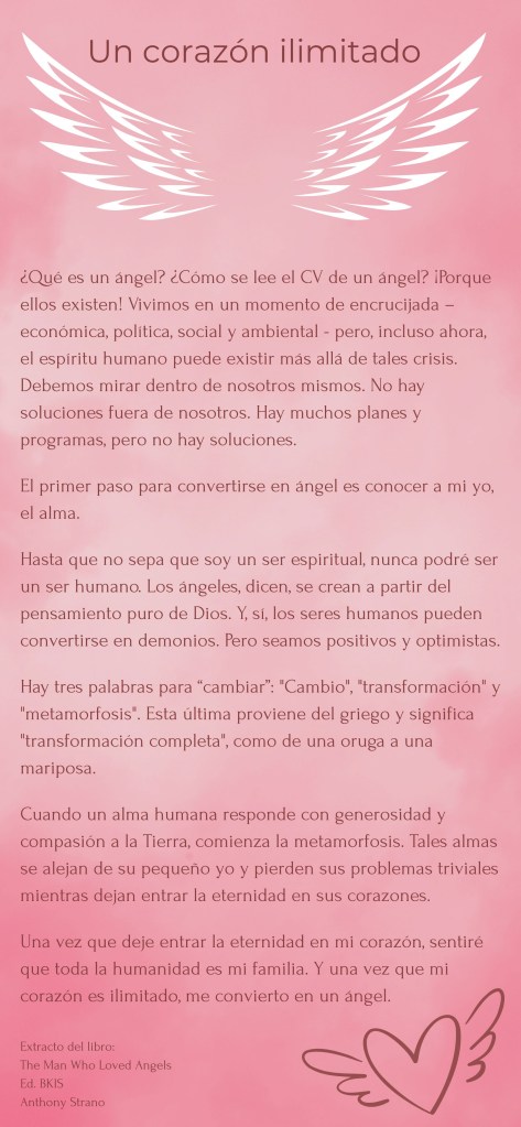¿Qué es un ángel? ¿Cómo se lee el CV de un àngel? ¡Porque ellos existen! Vivimos en un momento de encrucijada-económica, política, social y ambiental- pero, incluso ahora, el espíritu humano puede existir más allá de tales crisis. Debemos mirar dentro de nosotros mismos. No hay soluciones fuera de nosotros. Hay muchos planes y programas, pero no hay soluciones.