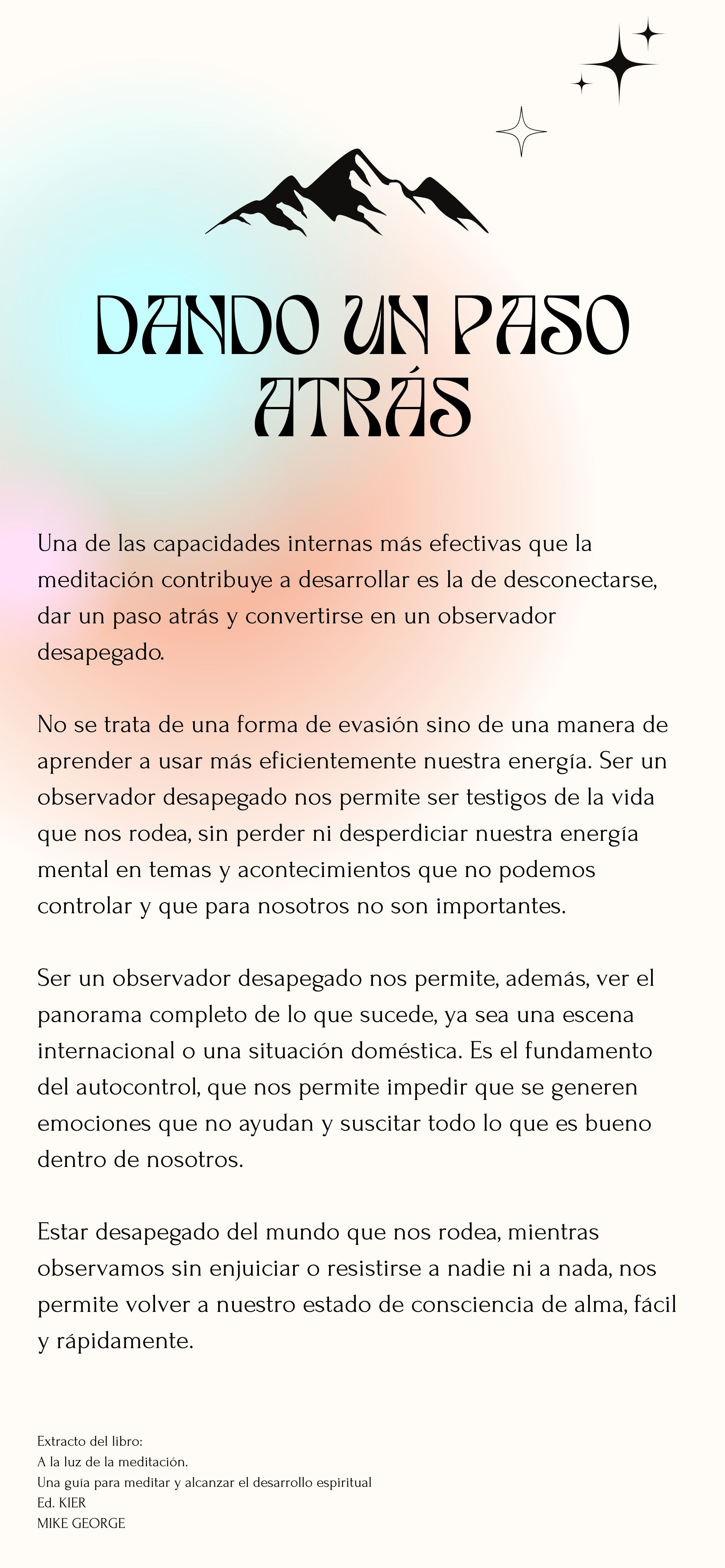 Estar desaferrat del món que ens envolta, mentre observem sense enjudiciar o resistir ningú ni res, ens permet tornar al nostre estat de consciència d’ànima, fàcil i ràpidament.