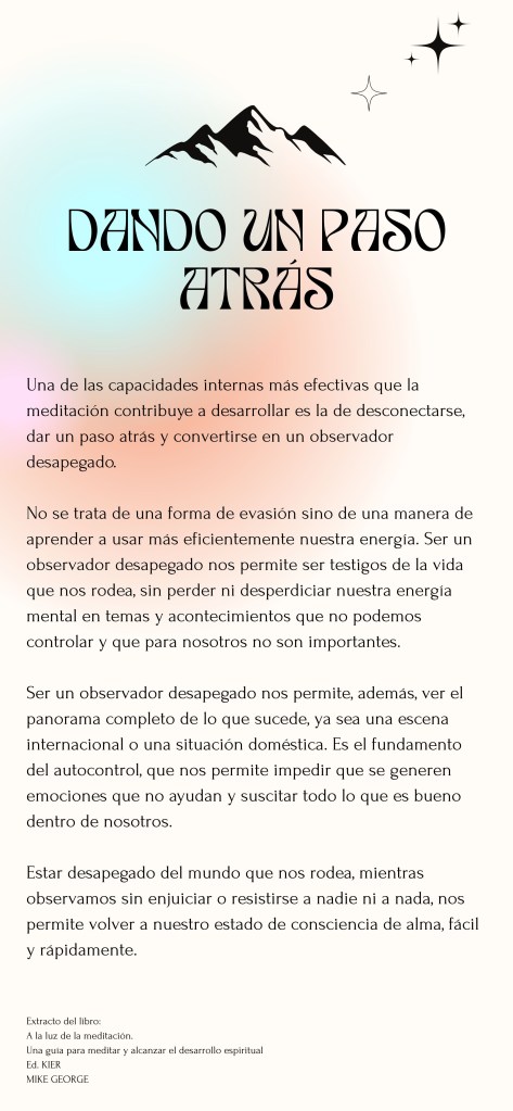 Una de les capacitats internes més efectives que la meditació contribueix a desenvolupar és la de desconnectar-se, fer un pas enrere i convertir-se en un observador desaferrat.