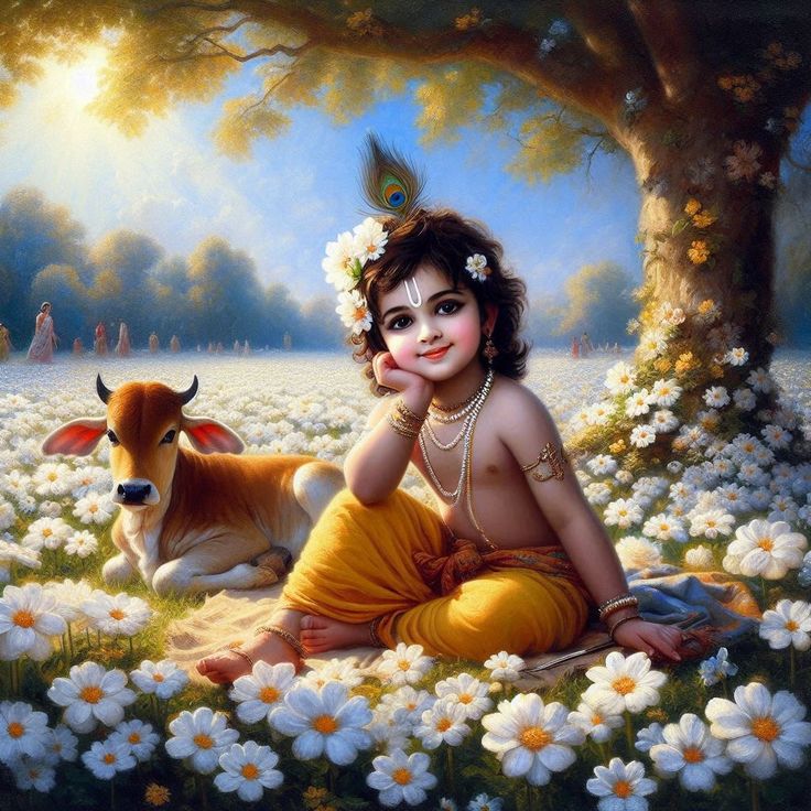 Decir que el niño Krishna se adorna con una pluma de pavo real sería como decir que el mundo en el que creció era tan cruel como el mundo en el que vivimos ahora… Nada más lejos de la realidad. En el mundo de donde proviene Shri Krishna existe un respeto natural, casi sagrado, por toda la naturaleza, incluyendo a los animales; jamás serían capaces de arrancar una pluma, por hermosa que sea, a un pavo real; ni siquiera recogerla del suelo si se hubiera desprendido accidentalmente.