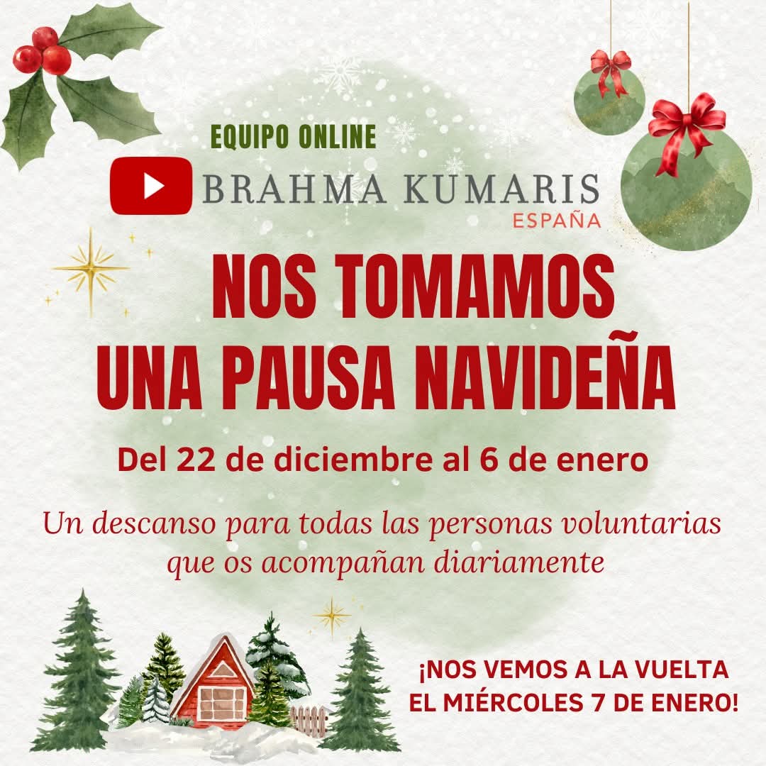 Estimados/as amigos/as:✨🎄✨🎁🧘🏻♀️✨ El equipo online de YouTube Brahma Kumaris España del lunes 22 de diciembre al martes 6 de enero nos tomamos una pausa navideña. Dando así un descanso a todas las personas voluntarias que cada día os acompañan y están cooperando incansablemente: moderadores del chat, editores de los vídeos, ponentes, el equipo de Ivoox, encargados de mensajes, web y blog.💫💫 ¡Volvemos el miércoles 7 de enero! 💫💫🏘️ Nuestros centros permanecerán abiertos ofreciendo variedad en actividades presenciales. Encuentra tu centro más cercano en nuestra web para estar informad@ https://www.brahmakumaris.es/actividades/agenda/centros 🧘♀️🧘♂️ ¡OS ESPERAMOS!Durante este tiempo, os recordamos que disponéis de todas nuestras actividades en nuestro canal de YouTube https://www.youtube.com/BrahmaKumarisEspaña y en las listas de reproducción: LISTADOS DE REPRODUCCIÓN POR TEMAS: 🔆 Meditaciones de la Mañana https://www.youtube.com/playlist?list=PL7n85NjJyQh9JOW4mITmv5a6hEAUpHm0C 🔆 Música para meditar 🎶🧘🏻♀️https://youtube.com/playlist?list=PL7n85NjJyQh8tdwX7zU_sq9uLd2CgPY9C 🔆 Calma – Paz – Silencio – Interior – Soledad https://youtube.com/playlist?list=PL7n85NjJyQh9dRX1ijxKyhT5tvUF1oKP1 🔆 Conciencia – Espiritualidad – Alma https://youtube.com/playlist?list=PL7n85NjJyQh-vKkIt4PyPQRmPlzB3KbKu 🔆 Autoestima- Superación – Determinación- Fortaleza https://youtube.com/playlist?list=PL7n85NjJyQh9pf5CAfXWIpZwSYNUTCJwP 🔆 Miedo – Estrés – Límites- Crisis – Enfermedad https://youtube.com/playlist?list=PL7n85NjJyQh8Y_0x9w6UMEnOc015_Ti9F 🔆 Relaciones – Desapego – Perdón https://youtube.com/playlist?list=PL7n85NjJyQh8RUiWU4xdBV0sOguSF6S_E 🔆 Positividad – Felicidad – Entusiasmo https://youtube.com/playlist?list=PL7n85NjJyQh8BKt7Hc4lWG_jaVPqoPIRI 🔆 Salud – Bienestar – Equilibrio – Energía https://youtube.com/playlist?list=PL7n85NjJyQh9PZzkgAvXxAU8FEQT22cwK 🔆 Cuidar y fortalecer la mente https://www.youtube.com/playlist?list=PL7n85NjJyQh_UpeDa9duZxDrd8SZJsL7L 🔆 Gestión del tiempo – Hábitos https://youtube.com/playlist?list=PL7n85NjJyQh9Zu6E2IyvV5ysf2mIAa_wA LISTADOS DE REPRODUCCIÓN POR PONENTES: 🔆 Guillermo Simó https://www.youtube.com/playlist?list=PL7n85NjJyQh_vusvPW_d2WIoKY63RSn6e🔆 Esperanza Santos https://www.youtube.com/playlist?list=PL7n85NjJyQh-NFvFWfaMdu8QltqKmuurq🔆 Marta Matarín https://www.youtube.com/playlist?list=PL7n85NjJyQh8VNnTRTjGIcN–WnvbK4Jv 🔆 Enrique Simó https://www.youtube.com/playlist?list=PL7n85NjJyQh_cNyP5p7aS1Po9c9BtYdq3 🔆 Elizabeth Gayán https://www.youtube.com/playlist?list=PL7n85NjJyQh8cehWdqUkMUVkFSRpuJm54 🔆 María Moreno https://www.youtube.com/playlist?list=PL7n85NjJyQh9JFi7laB9WqY2rGe28Mnwp🔆 Amadeo Dieste https://youtube.com/playlist?list=PL7n85NjJyQh_2YbiAUvCbWm91vIGFkmbG 🔆 Anabel Pérez https://youtube.com/playlist?list=PL7n85NjJyQh-kejNXlRMGpYBDs1cPlt8v 🔆 José A. Cruz https://www.youtube.com/playlist?list=PL7n85NjJyQh_fjda1Y4Rq-cM6ia9zUIZD 🔆 Paqui Martín https://www.youtube.com/playlist?list=PL7n85NjJyQh_nUBmcfA9E5SXyNZTDPiwN 🔆 Ramón Ribalta https://www.youtube.com/playlist?list=PL7n85NjJyQh8PJEvjX-ibMRW-zRglZDuh 🔆 Pilar Quera https://youtube.com/playlist?list=PL7n85NjJyQh-r2VRyG7-Lpug34TOr65wU 🔆 Blanca Bacete https://www.youtube.com/playlist?list=PL7n85NjJyQh-NNbMyEyXRMdP7YajWvzJ9 🔎 ¡¡¡Búscanos en la App de 📻IVOOX📻!!! por Brahma Kumaris España donde podrás escuchar/descargar todos los audios, mientras caminas, haces ejercicio, descansas… de nuestros vídeos del canal de YOUTUBE Brahma Kumaris España. AudioKiosko, podcast, radio, mp3 y más- iVoox https://www.ivoox.com/escuchar-audios-brahma-kumaris-espana_al_13464600_1.html?show=programs Disponible en 📱Play store y App Store🦻🎧También disponibles EN NUESTRA WEB TODOS los AUDIOS DE LAS MEDITACIONES Y CONFERENCIAS https://brahmakumaris.es/recursos/audio-visual/audio_conferencias 📽 VIDEOS / YOUTUBE en nuestra web: https://brahmakumaris.es/recursos/audio-visual/video-page Os animamos a que lo compartáis entre vuestros contactos y amistadesSaludos de paz.
