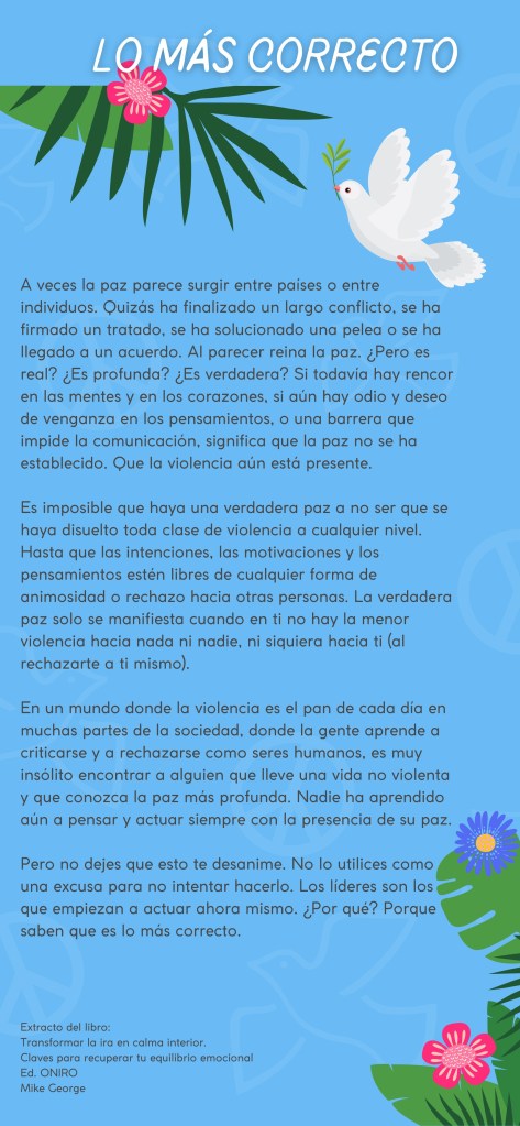 Es imposible que haya una verdadera paz a no ser que se haya disuelto toda clase de violencia a cualquier nivel. Hasta que las intenciones, las motivaciones y los pensamientos estén libres de cualquier forma de animosidad o rechazo hacia otras personas. La verdadera paz solo se manifiesta cuando en ti no hay la menor violencia hacia nada ni nadie, ni siquiera hacia ti (al rechazarte a ti mismo).