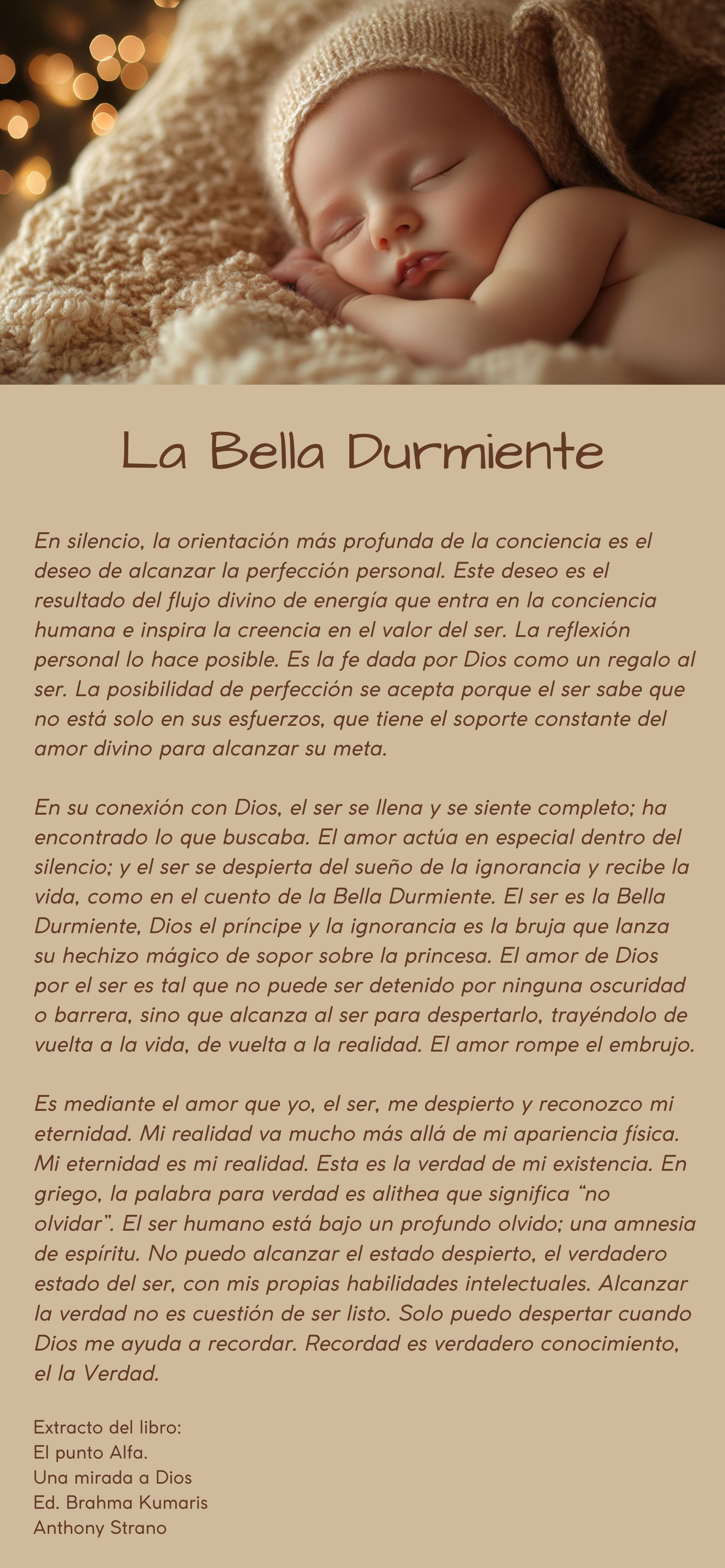 En la seva connexió amb Déu, l’ésser s’omple i se sent complet; ha trobat allò que buscava. L’amor actua especialment dins del silenci; i l’ésser es desperta del somni de la ignorància i rep la vida, com en el conte de la Bella Dorment. L’ésser és la Bella Dorment, Déu el príncep i la ignorància és la bruixa que llança el seu encanteri màgic de sopor sobre la princesa. L’amor de Déu per l’ésser és tan gran que no pot ser detingut per cap foscor o barrera, sinó que arriba a l’ésser per despertar-lo, portant-lo de tornada a la vida, de tornada a la realitat. L’amor trenca l’encanteri.