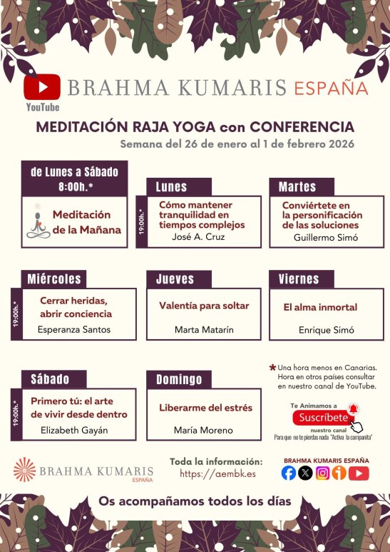 Del 26 de enero al 1 de febrero del 2026, te invitamos a participar en nuestras “Meditaciones Raja Yoga con conferencia” desde el Canal de YouTube Brahma Kumaris España. ✅Suscríbete y 🔔 Activa la Campanita para que no te pierdas nada https://www.youtube.com/BrahmaKumarisEspaña Os acompañamos todos los días.