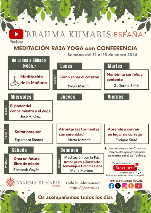 Del 23 de febrero al 1 de marzo del 2026, te invitamos a participar en nuestras “Meditaciones Raja Yoga con conferencia” desde el Canal de YouTube Brahma Kumaris España.