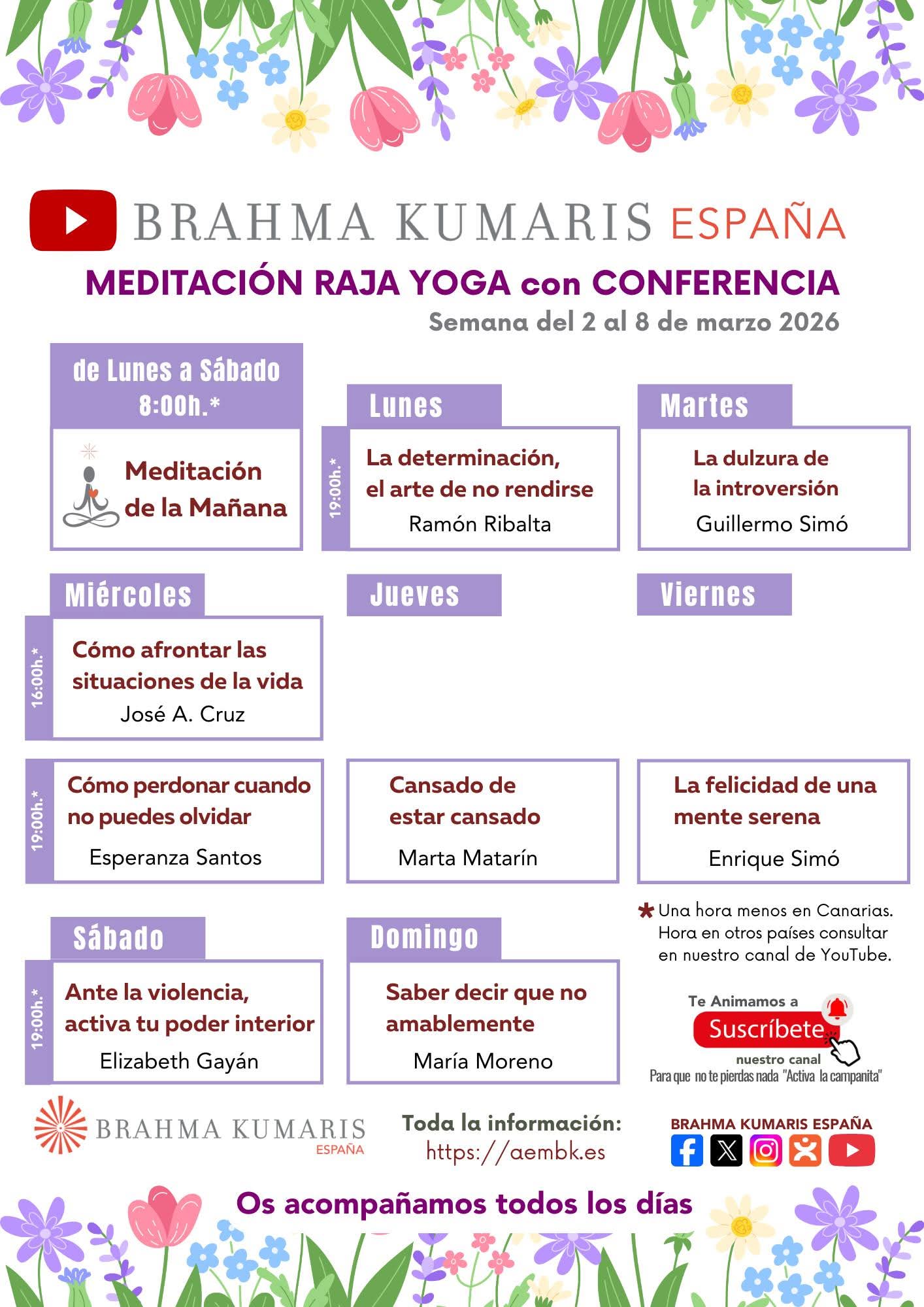 Del 2 al 8 de marzo del 2026, te invitamos a participar en nuestras “Meditaciones Raja Yoga con conferencia” desde el Canal de YouTube Brahma Kumaris España. ✅Suscríbete y 🔔 Activa la Campanita para que no te pierdas nada https://www.youtube.com/BrahmaKumarisEspaña Os acompañamos todos los días.