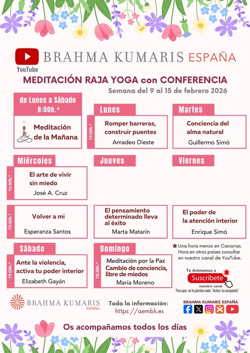 Del 9 al 15 de marzo del 2026, te invitamos a participar en nuestras “Meditaciones Raja Yoga con conferencia” desde el Canal de YouTube Brahma Kumaris España.