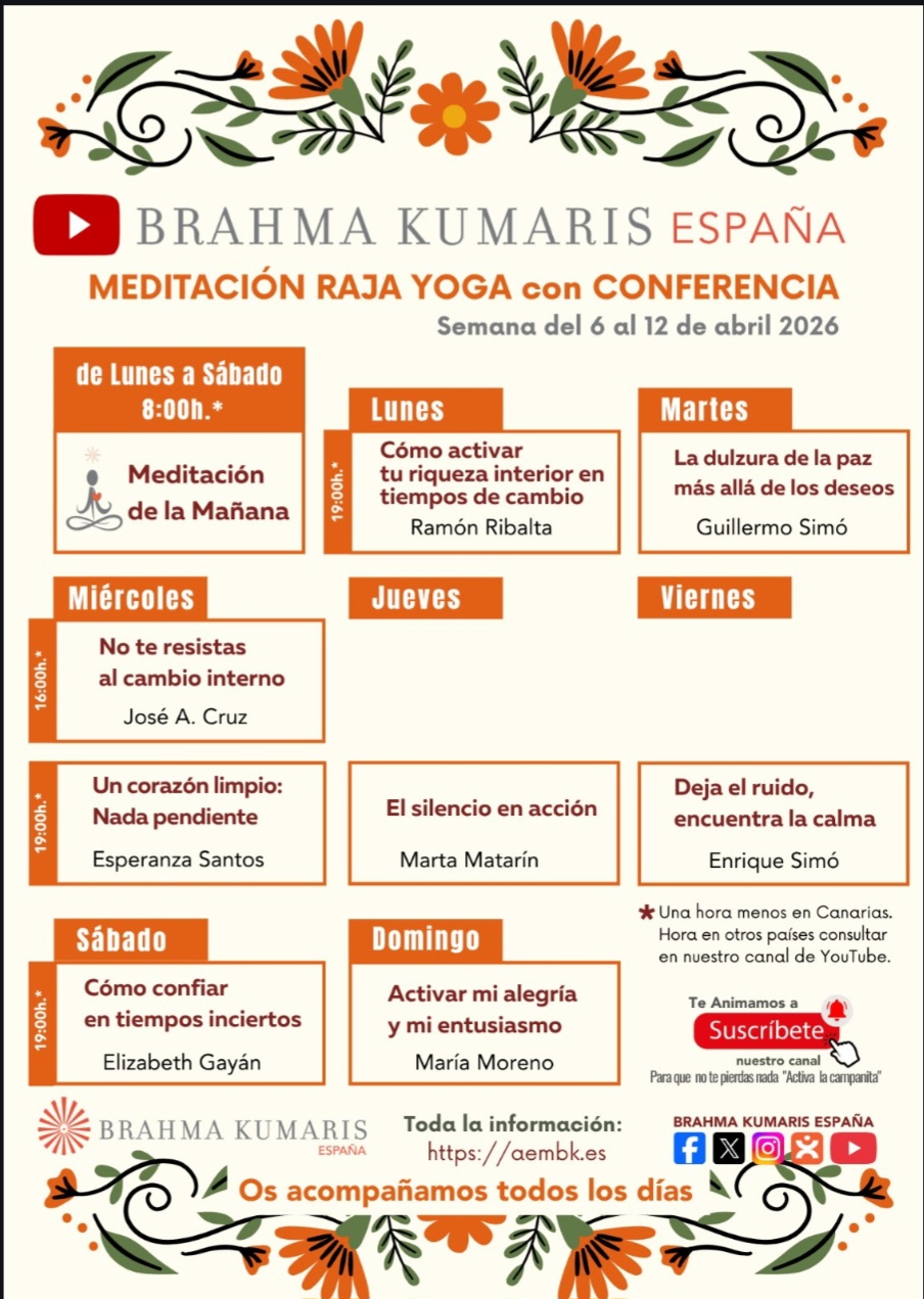 Del 6 al 12 de abril del 2026, te invitamos a participar en nuestras “Meditaciones Raja Yoga con conferencia” desde el Canal de YouTube Brahma Kumaris España.