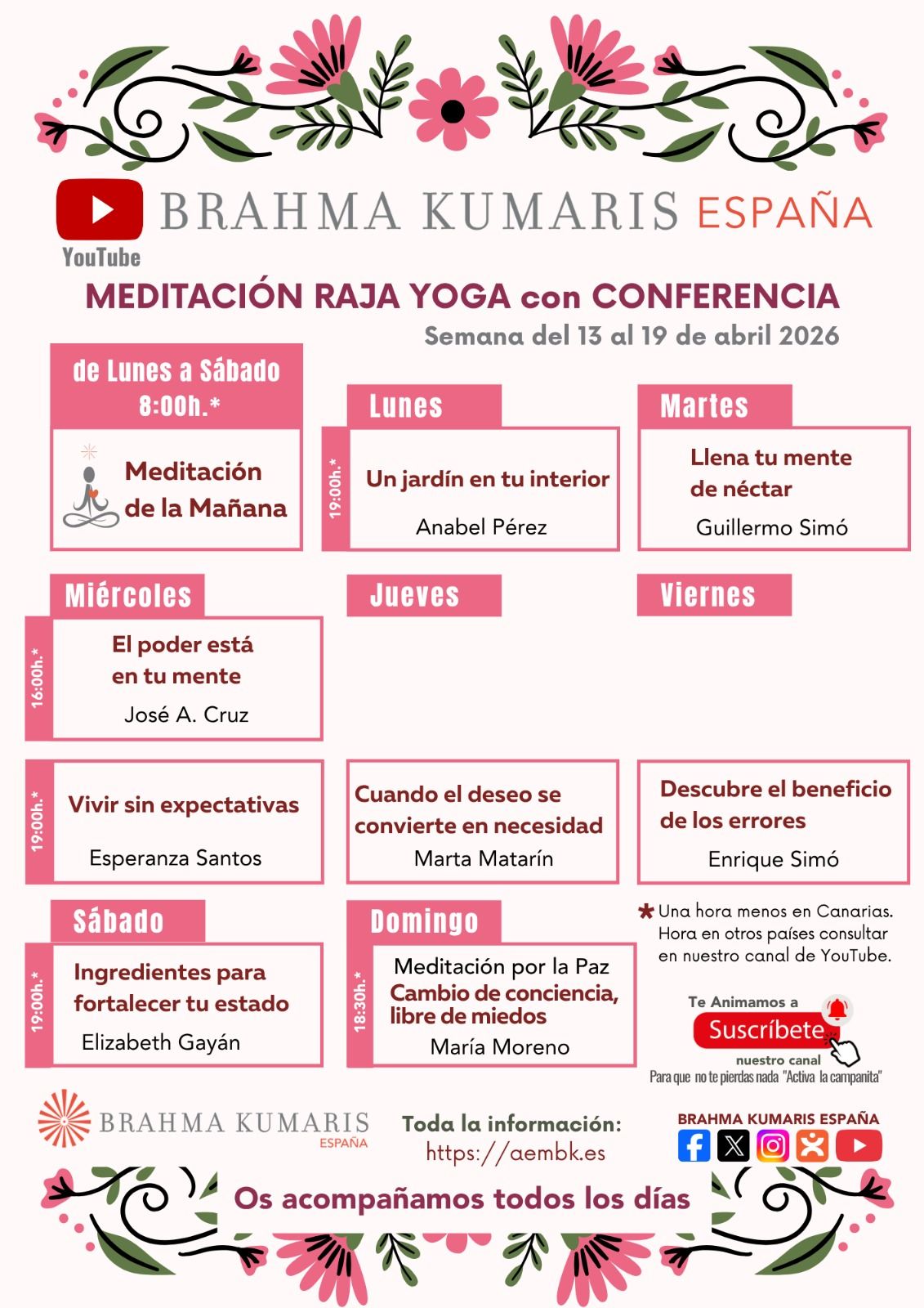 Del 13 al 19 de abril del 2026, te invitamos a participar en nuestras “Meditaciones Raja Yoga con conferencia” desde el Canal de YouTube Brahma Kumaris España.